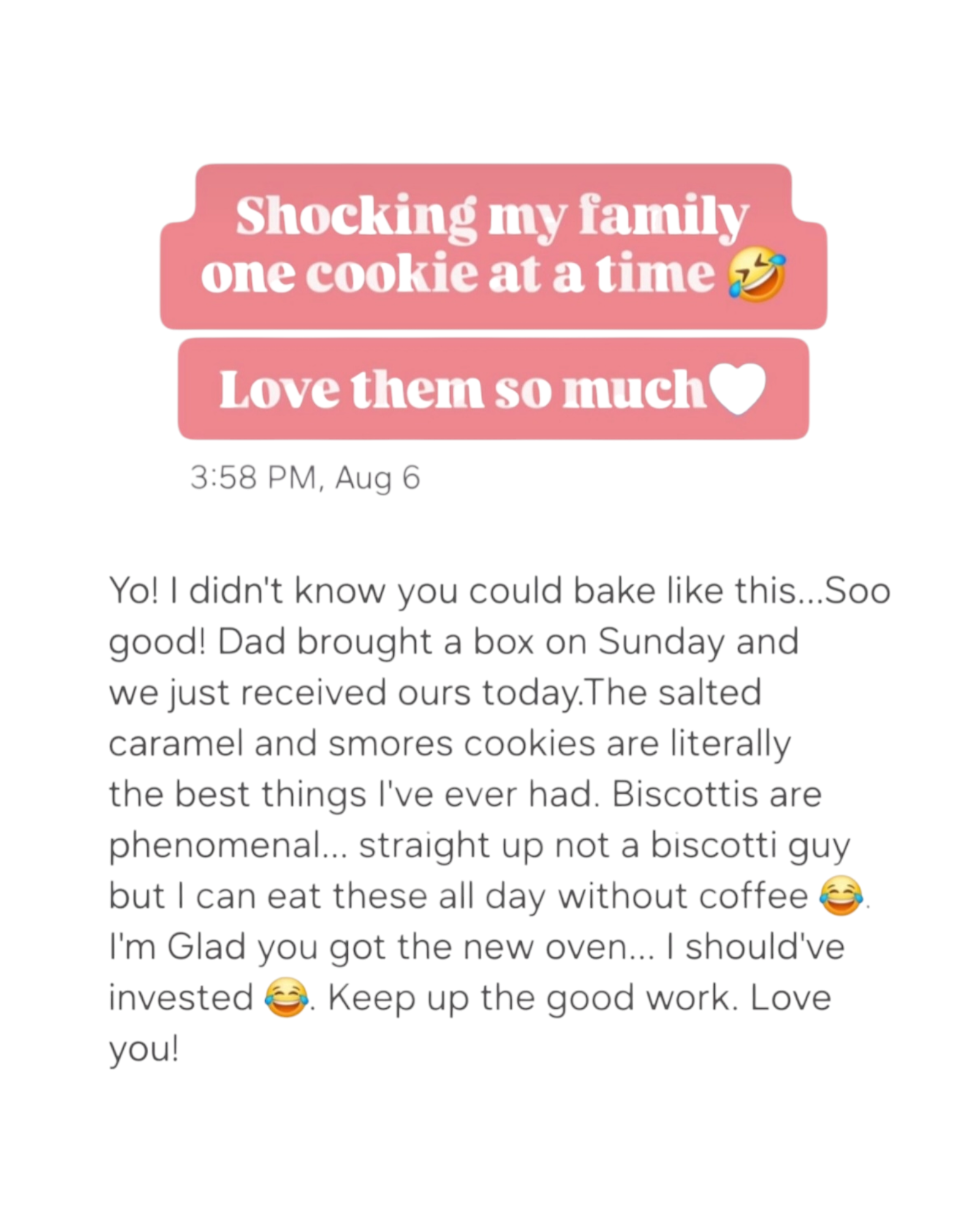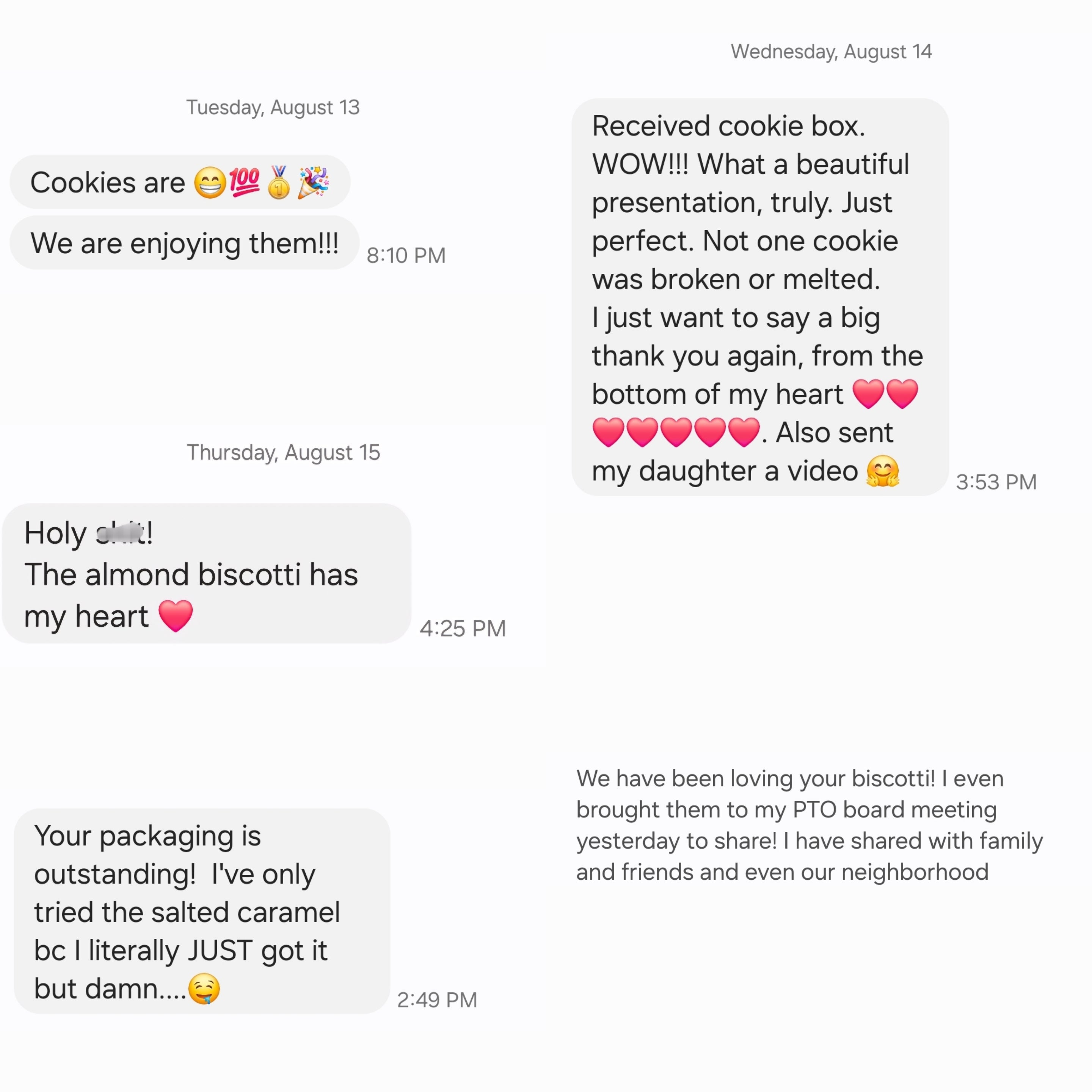 I received a box of cookies and biscotti for Mother's Day, and it was such a wonderful surprise! From the moment I opened the package, I could tell so much love and care went into it. The cookies were absolutely incredible—honestly the best I’ve ever eaten. Each bite was pure perfection. The biscotti was equally delicious and perfect with my morning coffee.